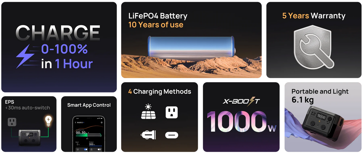 Our state-of-the-art Battery Management System (BMS) constantly monitors the voltage, current, and temperature of RIVER 2 Series with multiple aspects of protection, extending its life to the max.2