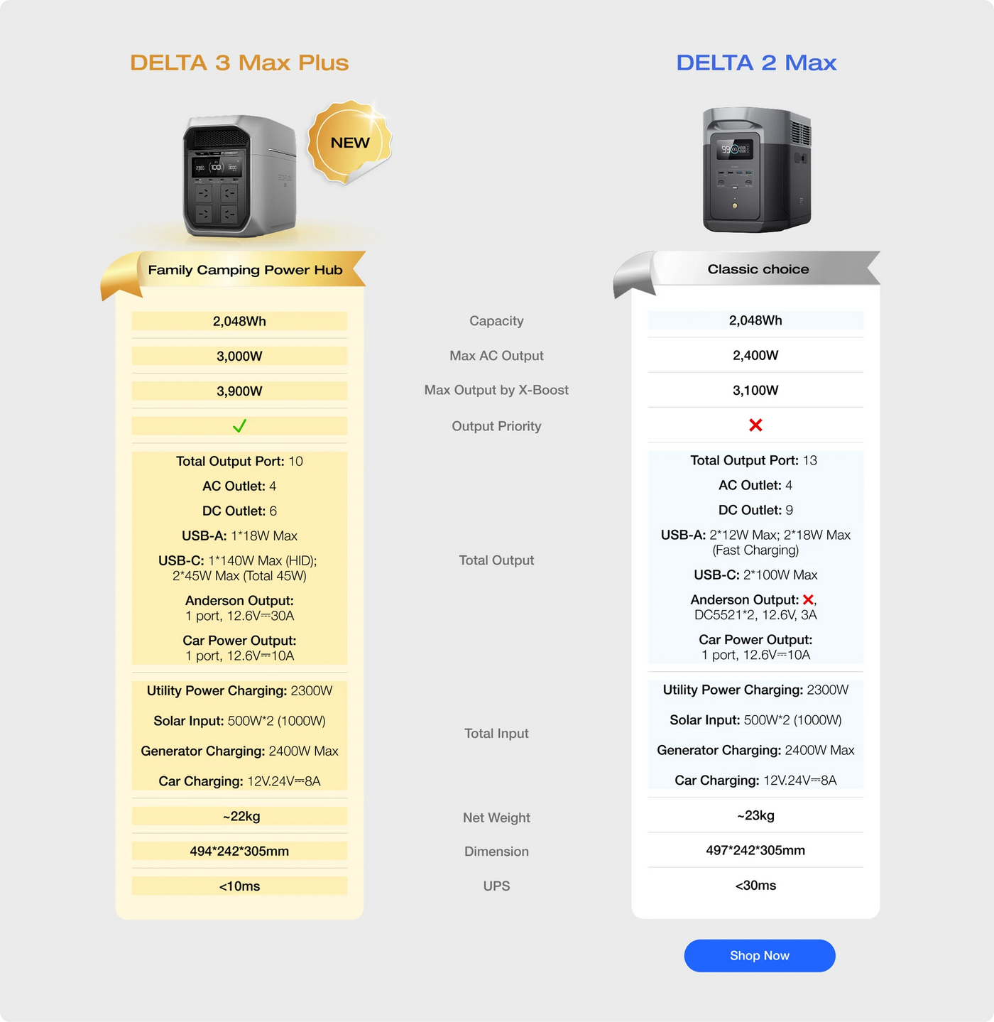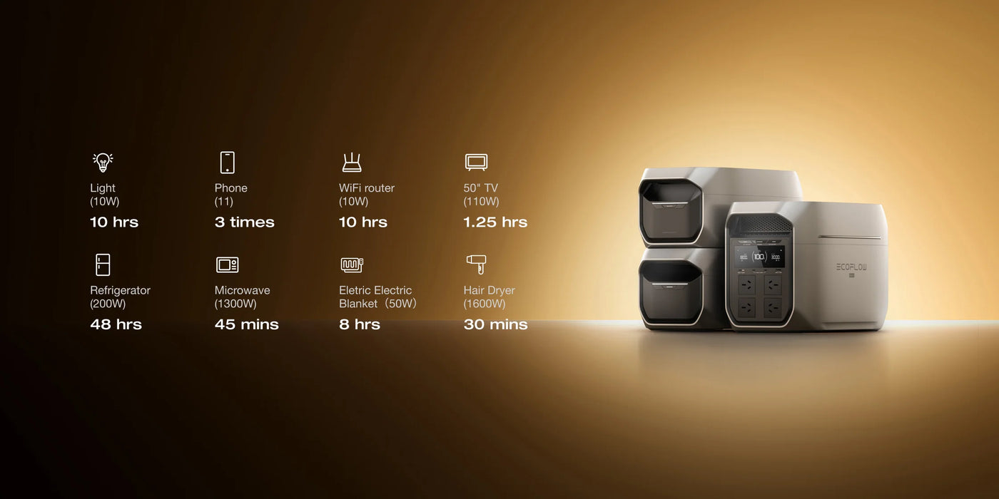 DELTA 3 Max Plus delivers 3000W AC rated output (6000W surge). With X-Boost™ 3.0 technology, it supports devices up to 3900W—effortlessly taking on your heavy-duty appliances.