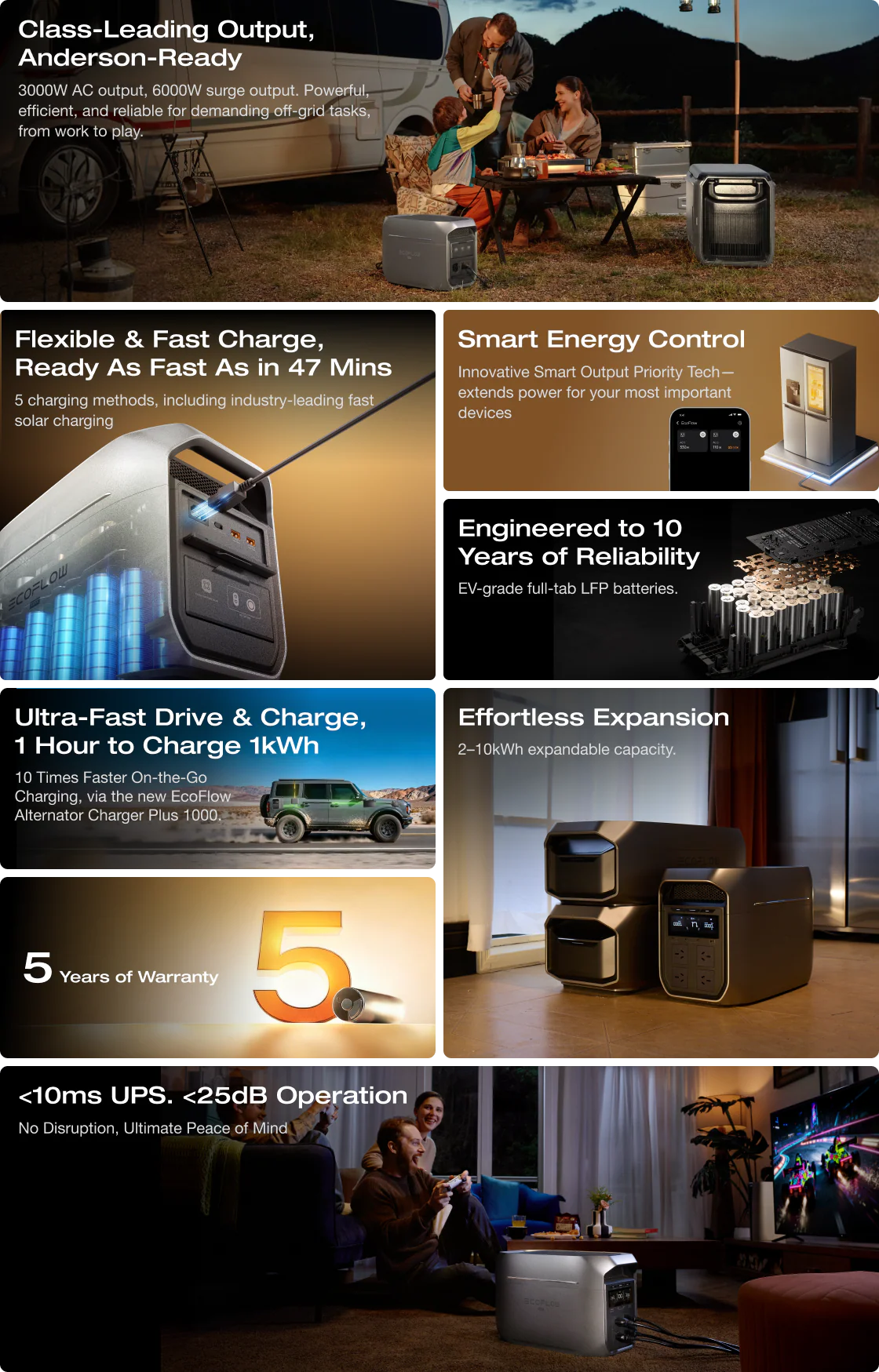 - 5 fast recharging methods: AC, Solar, Alternator Charger, Smart Generator, and Multi-charging