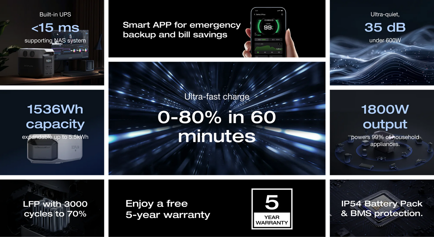With the unique expandable capacity design, DELTA 3 1500 offers a large 1536Wh battery capacity, expandable to 5500Wh. Keeps your appliances running, for outdoor activity or as home backup. It’s flexible and on-demand energy.