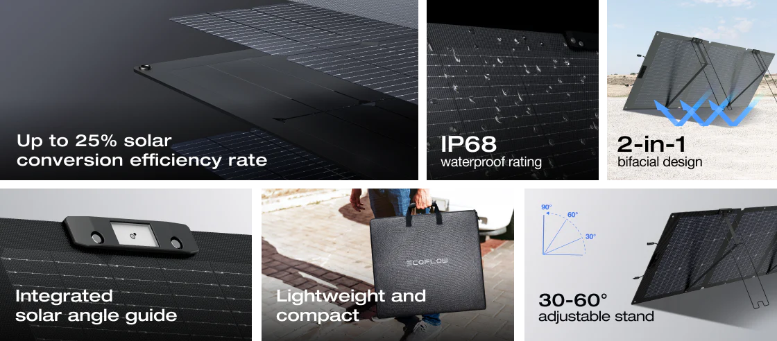 With a 160W front side and a 125W rear panel for capturing ambient light, the bifacial design increases solar input by up to 28%, helping you recharge faster than ever.