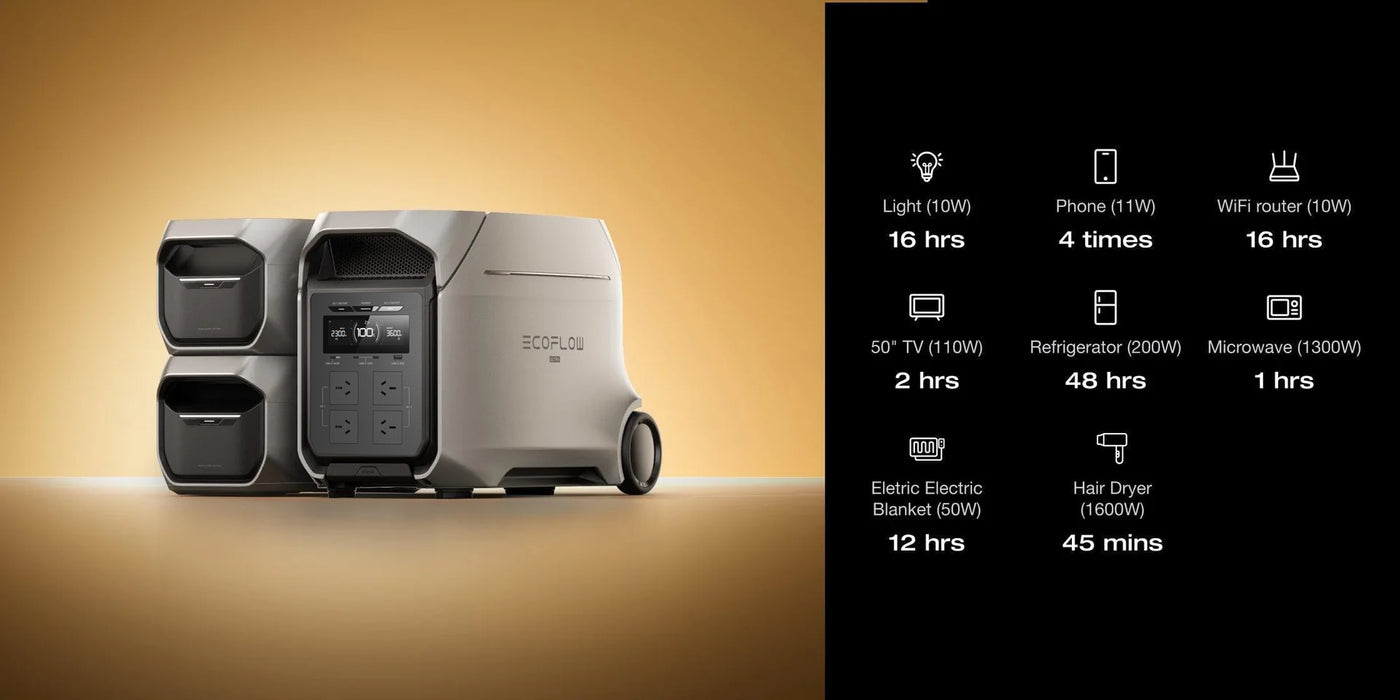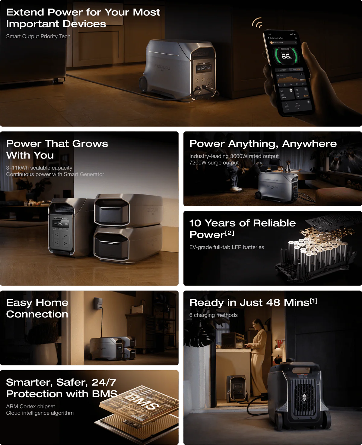 - 3-11kWh Expandable Capacity:Easily scale up, and can achieve longer runtime with an EcoFlow Smart Generator featuring automatic start and stop.