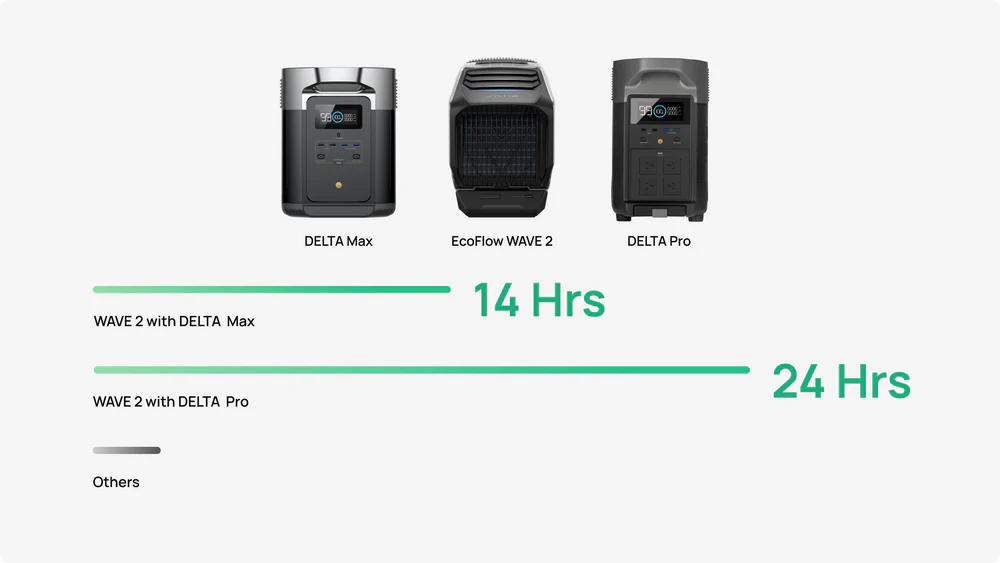 WAVE 2 is just the start. Pair with an EcoFlow DELTA Max / DELETA Pro or their extra batteries and get an astonishing 7-14hr run time in Eco Mode. Compared to using other portable power stations, it's 28% more efficient. You can also use any portable power station with a 820W input to charge your WAVE 2.